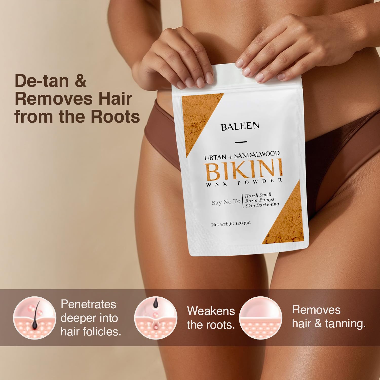 BALEEN Bikini Wax Powder Women with Ubtan & Sandalwood 120 Gm (Pack Of 1) | Painless Herbal Hair Removal Powder for women Bikini Area, Legs, Hands & Underarms with No Harmful Chemicals, No Irritation, No Skin Rashes