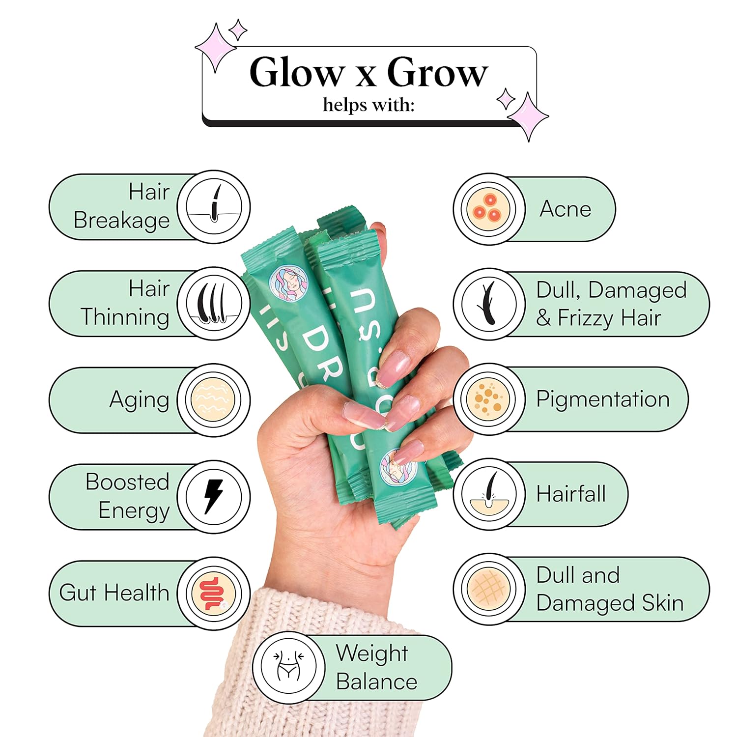 1 month supply: One pouch of Dr Su Glow x Grow for glowing skin, stronger hair and healthy gut comes with 30 travel friendly sachet!
