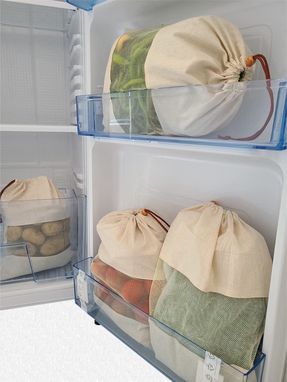 FRIDGE Vegetables and Fruits Bags Are Non-Toxic and Chemical Less Made From Natural Delicate Cotton Fabric, Which Keeps Fruits and Vegetables Fresh For Longer Time In Fridge and Kitchen.