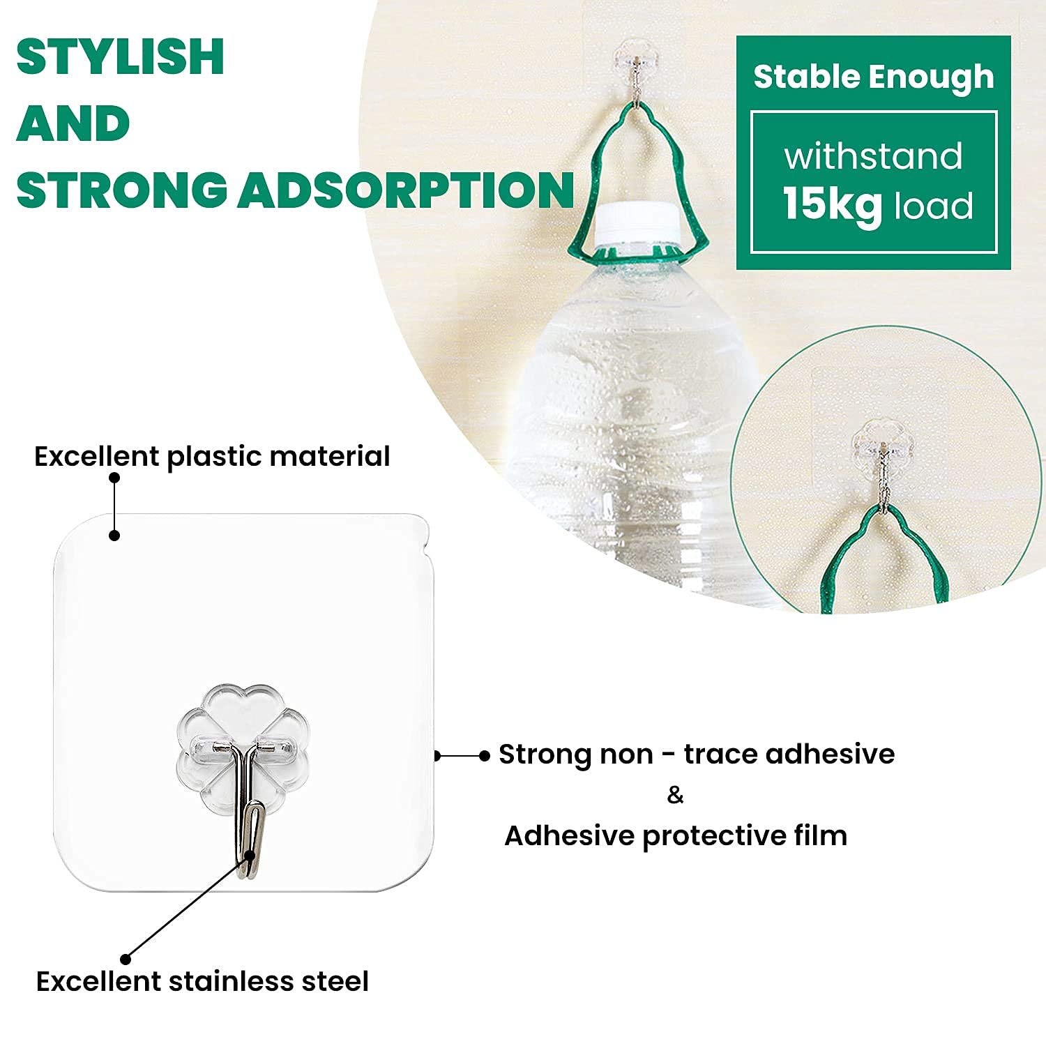 Rust-Proof and Waterproof Wall Hooks There are ten self-adhesive hooks in each pack; the wall hooks for hanging are constructed of stainless steel and pvc, which are rust-proof, waterproof, and sturdy. The innovative translucent design makes it almost invisible, adding convenience to your home and workplace life without sacrificing beauty.Utility hooks by