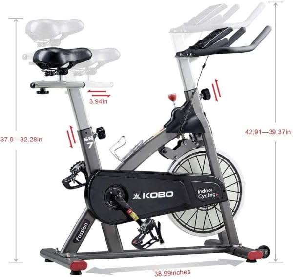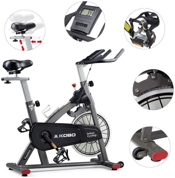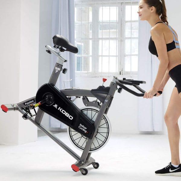 Kobo sb-7 magnetic spin bike: flywheel system: 8 kg. Max user weight: 120Kg magnetic resistance gives feel of 16 kg resistance. Set up assembly size: (L) 38.99 x (w) 18.11 x (high) 39.37-42.91 inches. Weight of exercise bike 30 kg. Console with LCD display: scan, speed, distance, time, calories, pulse. Seat position: both side adjustable vertically and horizontally. Handlebar position: vertical adjustment. Moving wheels for transportation and adjustable feet for floor levelling magnetic flywheel offers more momentum to give you a challenging exercise experience while cycling and enjoy an incredibly smooth, nearly silent and stabilize ride. Silent belt drive mechanism system adjustable resistance for the ultimate workout. Adjust the intensity of your exercise bike with the convenient tension knob. Press down the emergency knob to stop spinning immediately. Solid frame and safety assurance: the magnetic exercise bike frame is stronger and heavier. Easy DIY installation. Buyer has to assemble himself. Assembly tools and assembly manual are inside packaging.