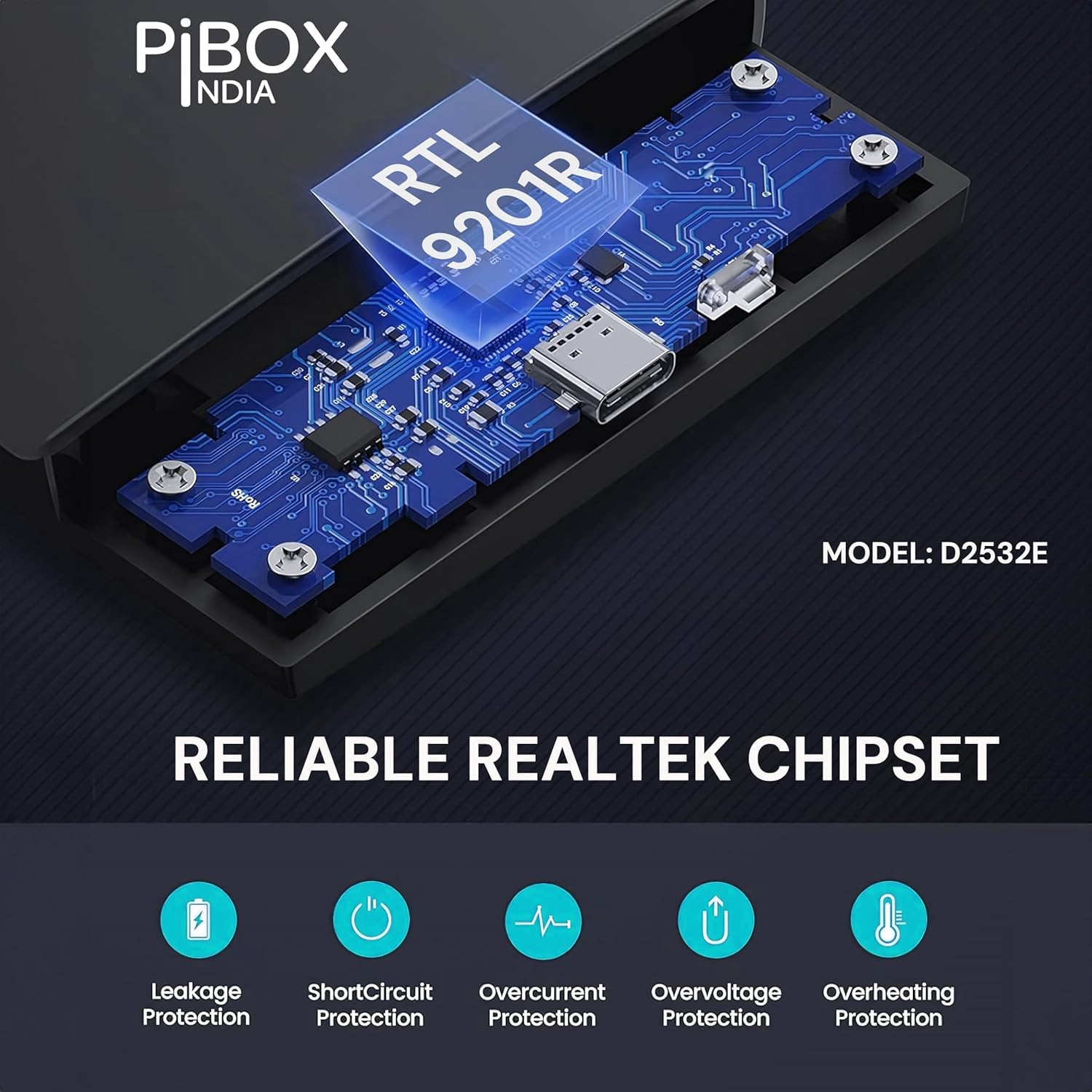 PiBOX India 2.5″ enclosure safeguards 7/9.5mm SATA SSDs/HDDs ≤4TB. 6Gbps UASP transfers, 30% faster than USB 3.0. Robust ABS plastic with over-current, over-voltage & overheating protection. Plug-n-play, hot-swap, status LED.Ideal for data transfer, storage expansion, recovering old drives.