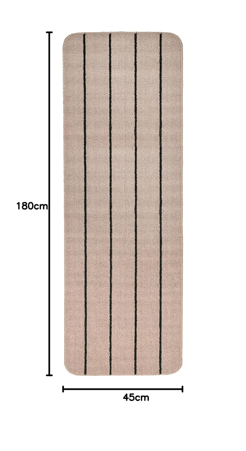 Features: Anti-Skid rubber latex backing stick to floor, Multipurpose bedside/ kitchen runner, 43 x180 CM Size, Stripe pattern, Rectangular shape Well stitched Overlocked Border.