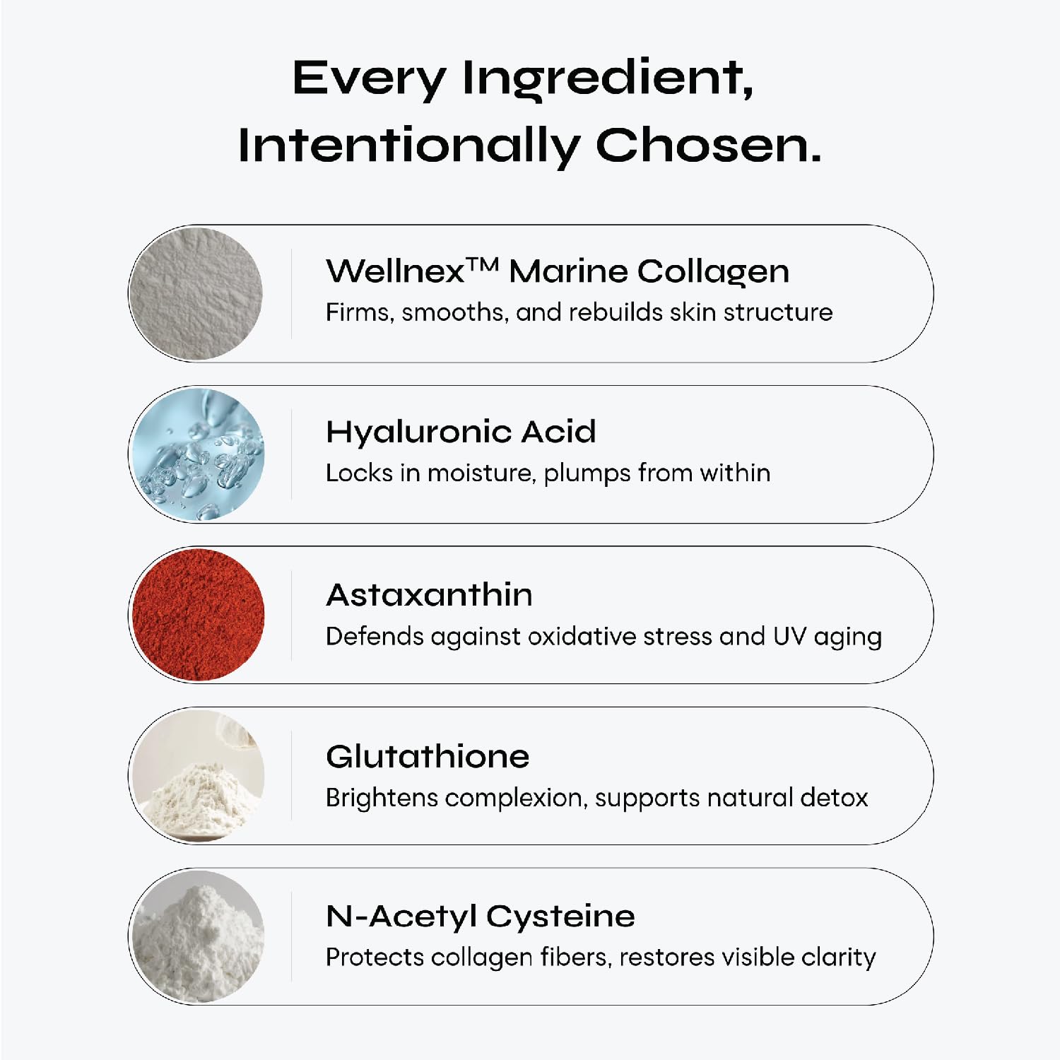 1️⃣ Premium Marine Collagen Blend – Each sachet delivers 8000mg of wild-caught marine collagen, combined with Glutathione, NAC, and Biotin to support overall skin and hair nourishment.